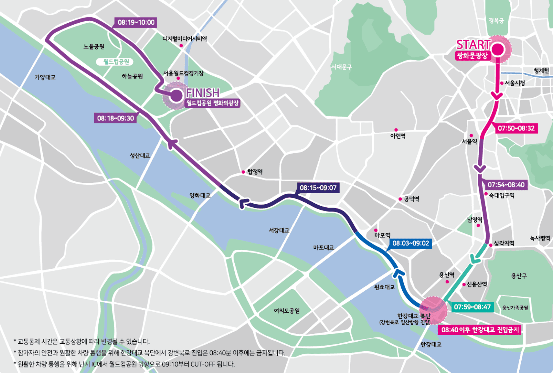 ▶ 코스정보 : 광화문광장(출발) > 시청 > 남대문 > 서울역 > 용산역 > 한강대교 북단(강변북로진입) > 원효대교 > 마포대교 > 서강대교 > 양화대교 > 성산대교 > 난지IC (강변북로진출) > 월드컵공원 평화광장(도착)