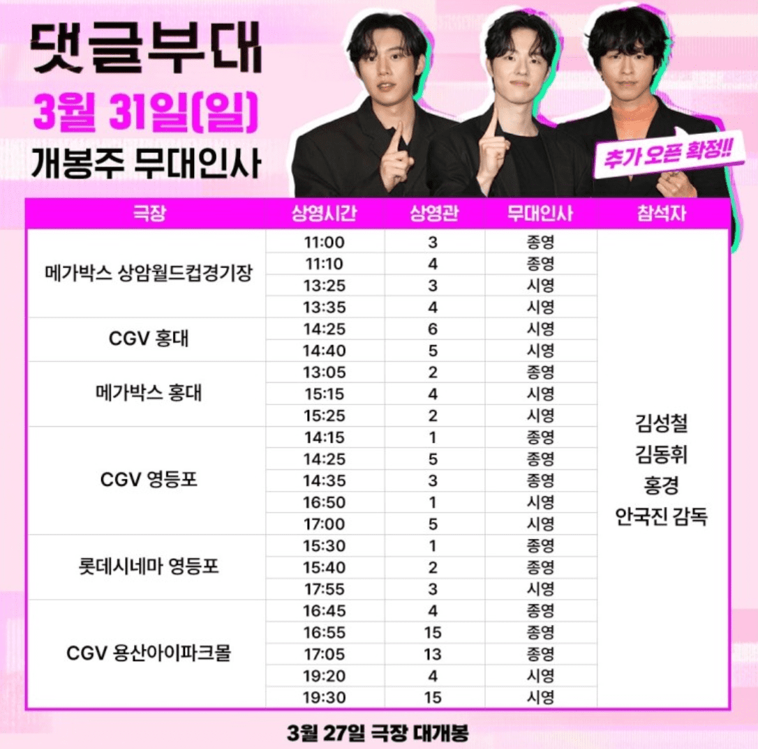 영화 <댓글부대> 는 24년 3월 27일 수요일에 개봉합니다. 개봉하는 주의 금요일과 일요일에 무대인사 일정이 확정되었습니다. 메가박스와 롯데시네마, CGV 상영관에서 무대인사 일정이 잡혔으며 3월 29일 금요일과 31일 일요일 양일에 걸쳐 무대인사가 진행됩니다. 각 날짜별로 무대인사에 참여하는 참석자가 다르기 때문에 확인해보시고 원하는 참석자가 있는 날짜 확인해보시고 예매하시길 바랍니다. 참고로 손석구 배우님은 3월 29일 금요일 메가박스 코엑스에 진행되는 무대인사에만 참여하시니 참고하시면 좋을 것 같습니다.