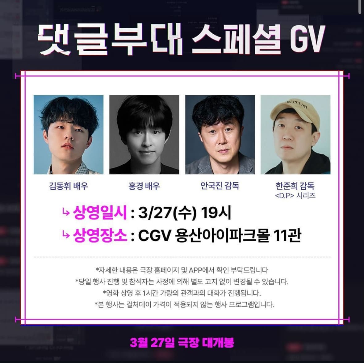 3월 27일 수요일 댓글부대가 개봉하는 날 CGV 용산아이파크몰 11관에서 댓글부대 스페셜 GV가 진행됩니다. 참석자는 김동휘배우, 홍경 배우, 안국진감독, 한준희 감독으로 영화에 대한 다양한 이야기를 들어볼 수 있는 기회입니다. 영화의 뒷이야기가 궁금하신 분들은 GV에 참석하셔서 감독님과 배우분들에게 직접 질문도 하고 여러 영화적 이야기를 들어볼 수 있는 기회를 만들어 보시길 바랍니다.
